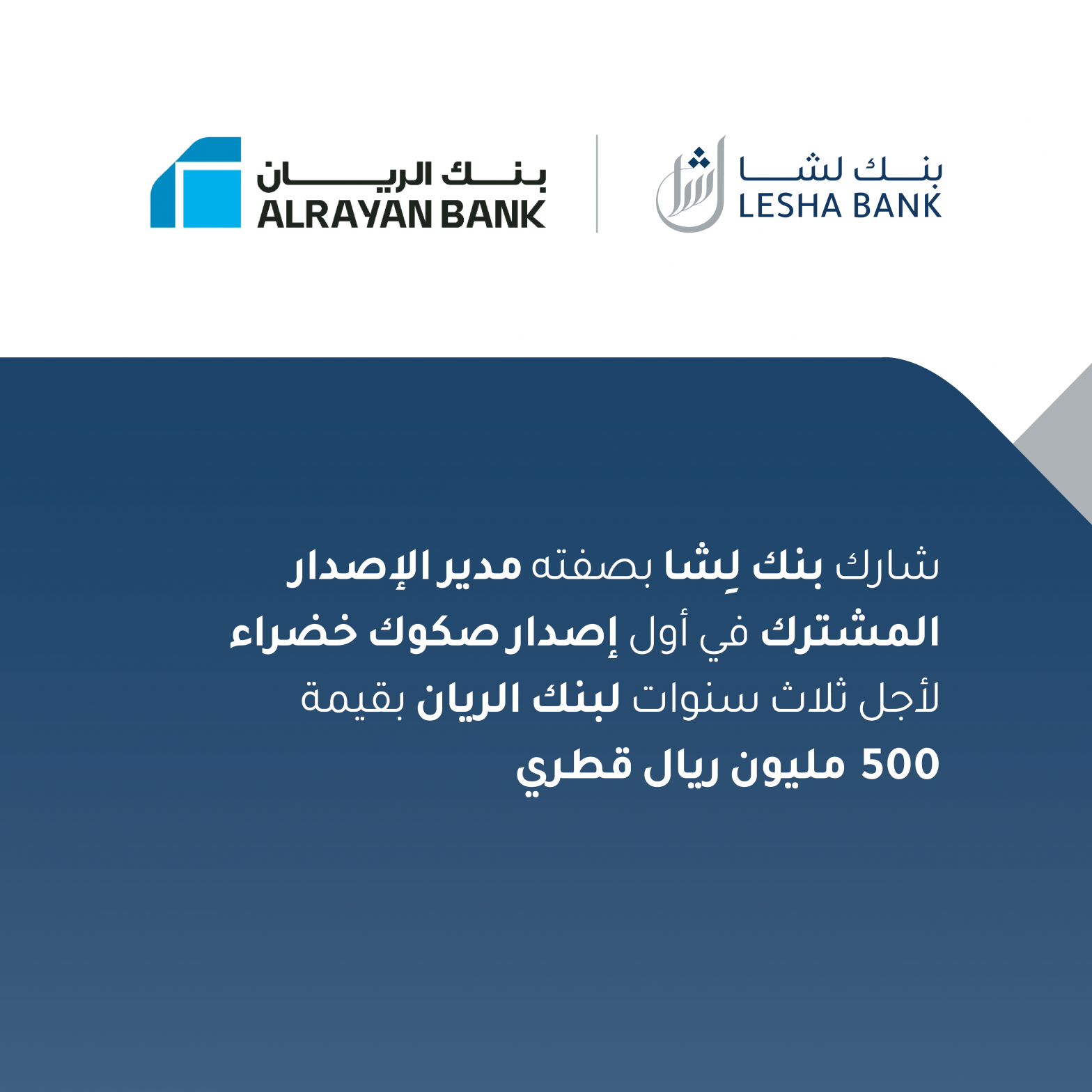 أخبار : شارك بنك لِشا بصفته مدير الإصدار المشترك في أول إصدار صكوك خضراء لأجل ثلاث سنوات لبنك الريان بقيمة 500 مليون ريال قطري